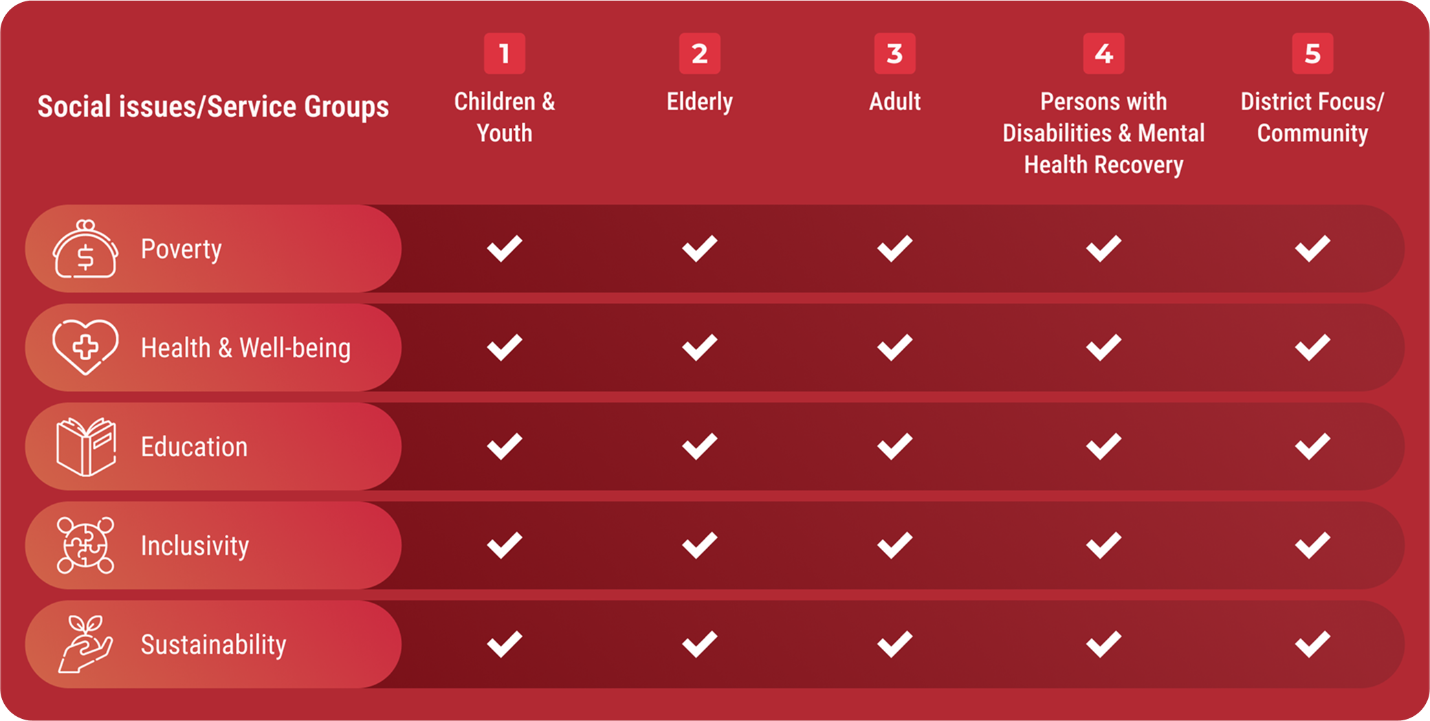 We focus on various social issues and service targets to cater the unmet needs in the communities.